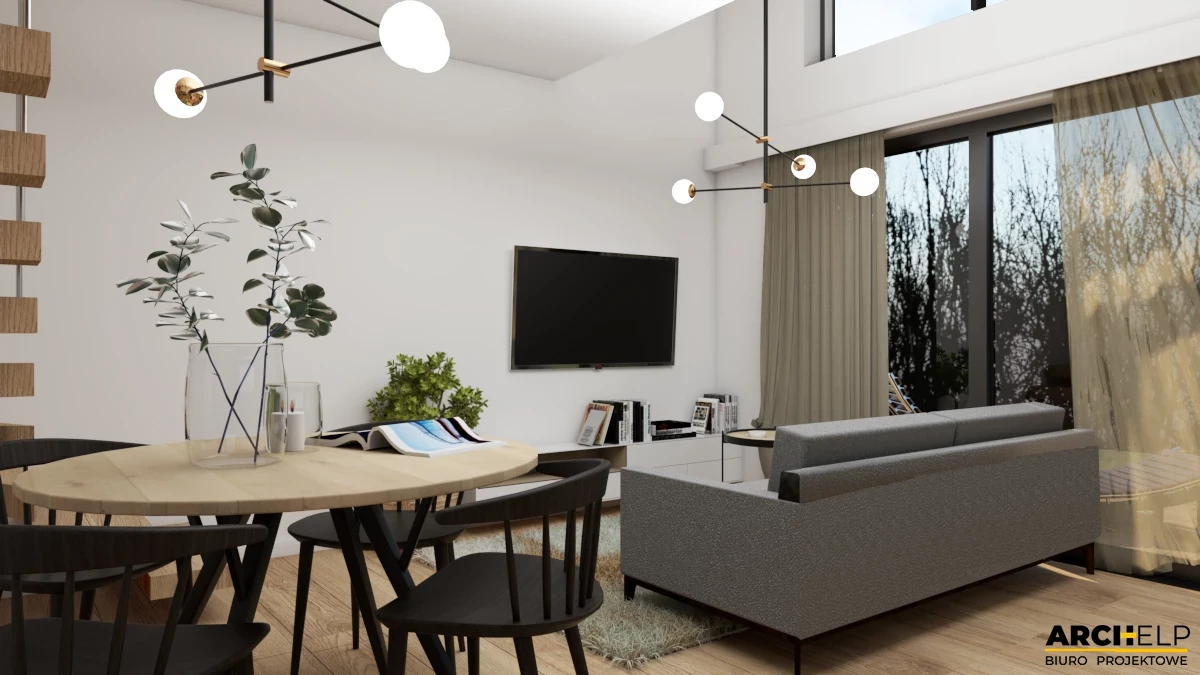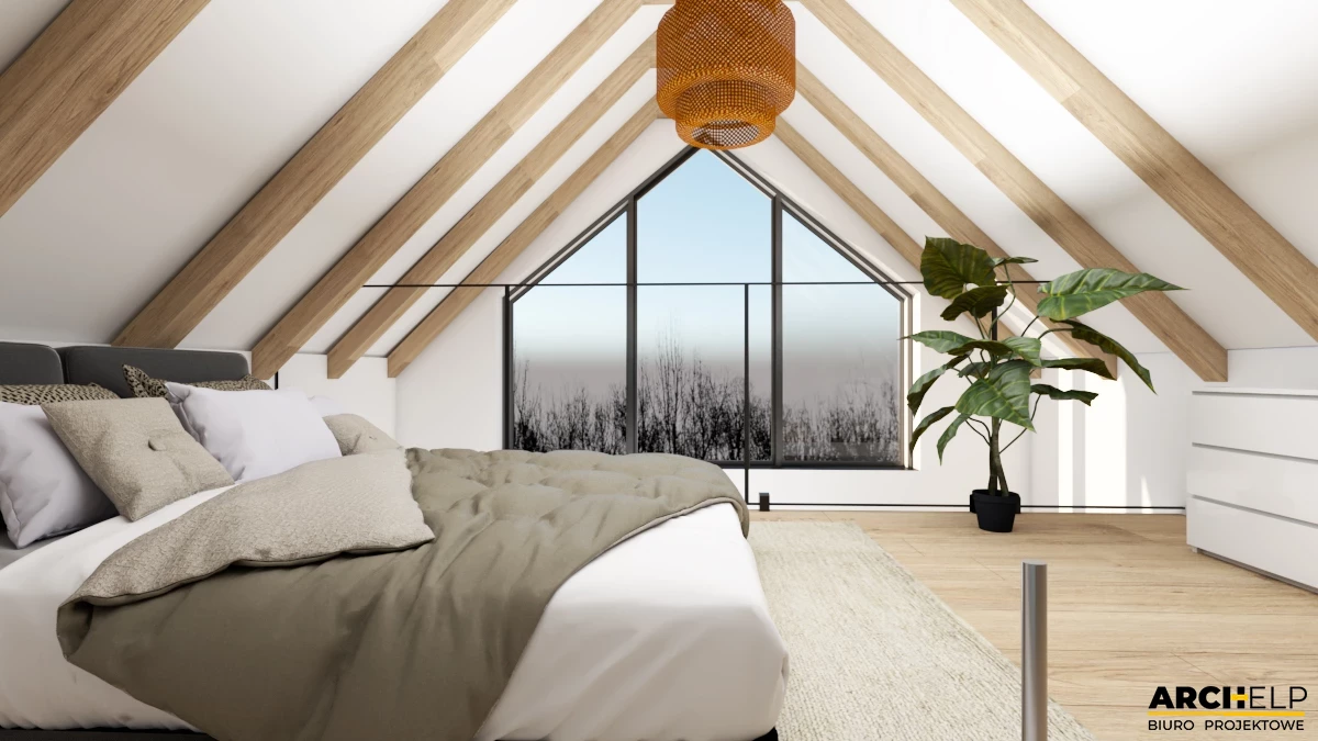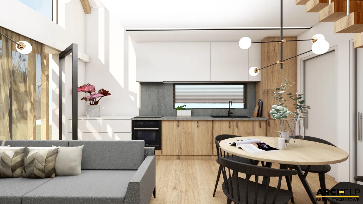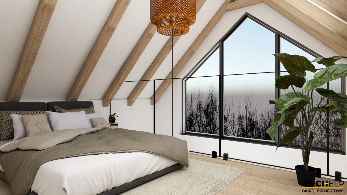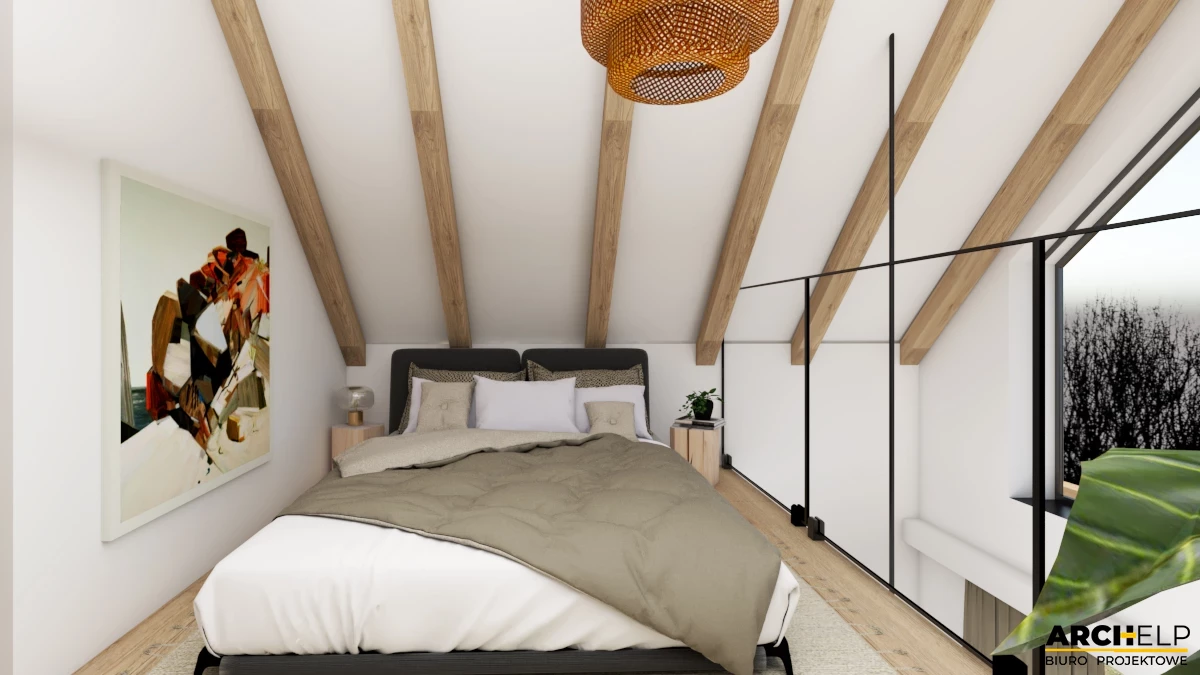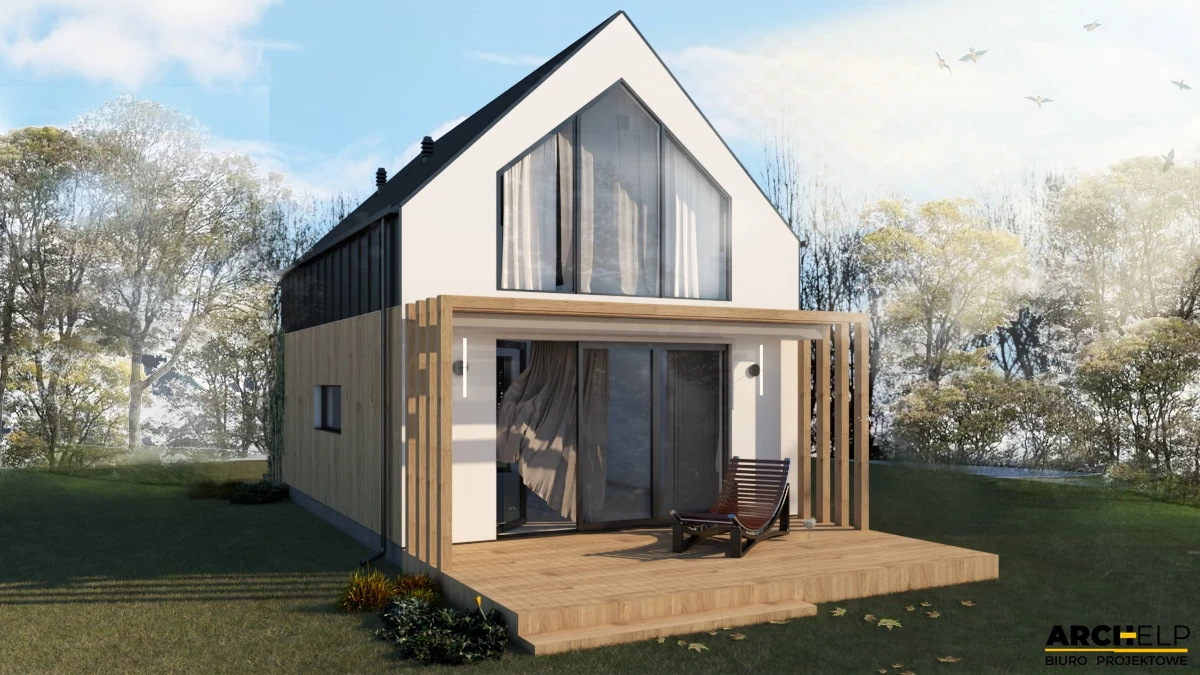 Projekt małego i nowoczesnego domku letniskowego, który NIE WYMAGA pozwolenia na budowę! Idealna propozycja dla osób ceniących sobie kontakt z naturą. Dzięki panoramicznym przeszklenią, które naturalnie doświetlają wnętrze możemy podziwiać otoczenie wokół budynku. Bryła budynku dzięki prostemu kształtowi i wykończeniu jest utrzymana w stylu nowoczesnej stodoły. Dach dwuspadowy pokryty blachą na rąbek, która częściowo jest również położona na ścianach. Tynk jasny który wspaniale współgra z drewnianą okładziną - to wszystko tworzy niezwykły efekt nowoczesnego budynku. Na parterze zaprojektowano mały wiatrołap, łazienkę z prysznicem oraz strefę dzienną gdzie znajdziemy salon z sofą przed TV, stół z krzesłami i aneks kuchenny. Przesuwne przeszklenie tarasowe łączy wnętrze z tarasem. Strefa nocna mieści się na antresoli gdzie można wstawić 3 łóżka: dwa 1-osobowe i jedno 2-osobowe. Dwa panoramiczne przeszklenie gwarantują piękny widok po przebudzeniu.