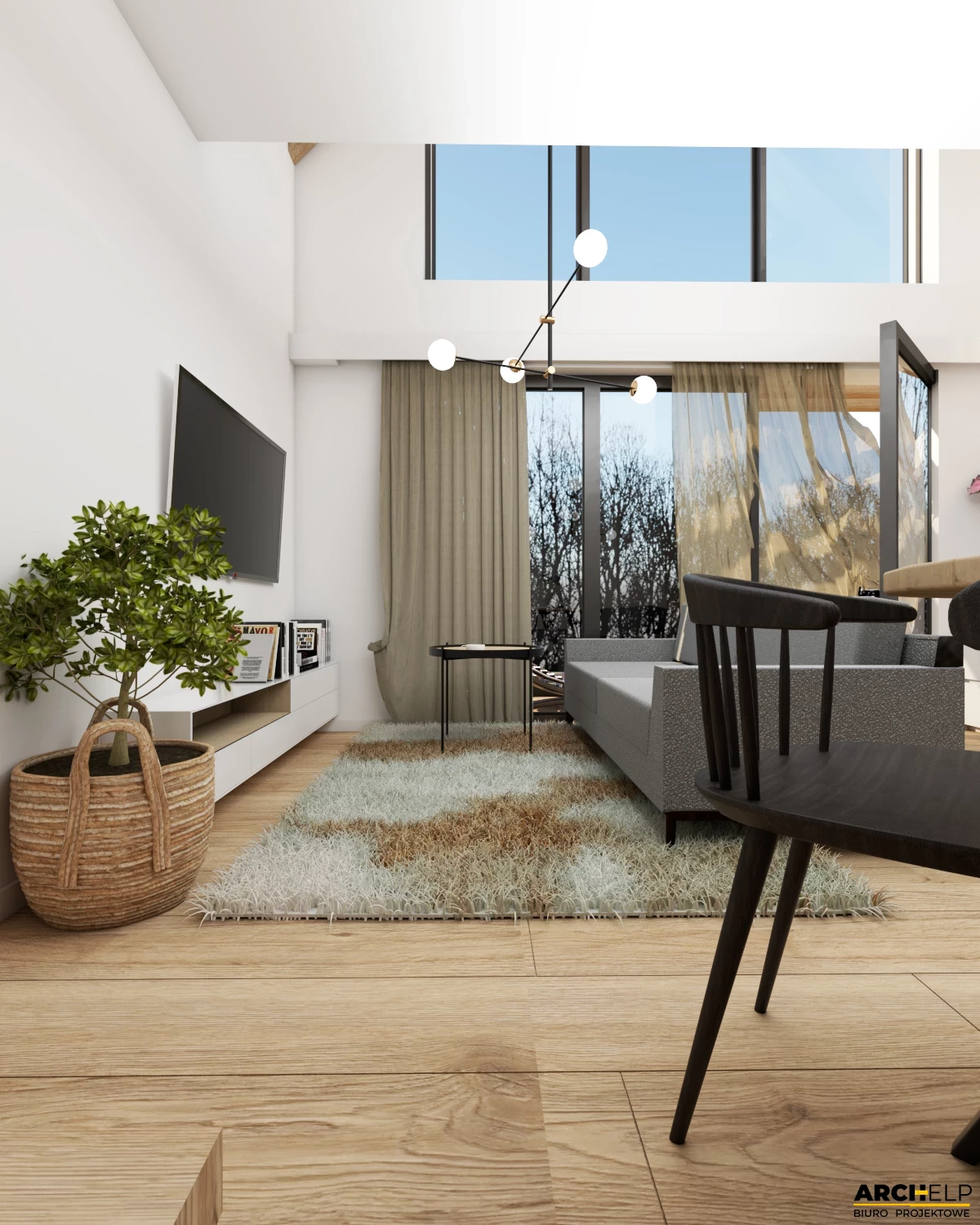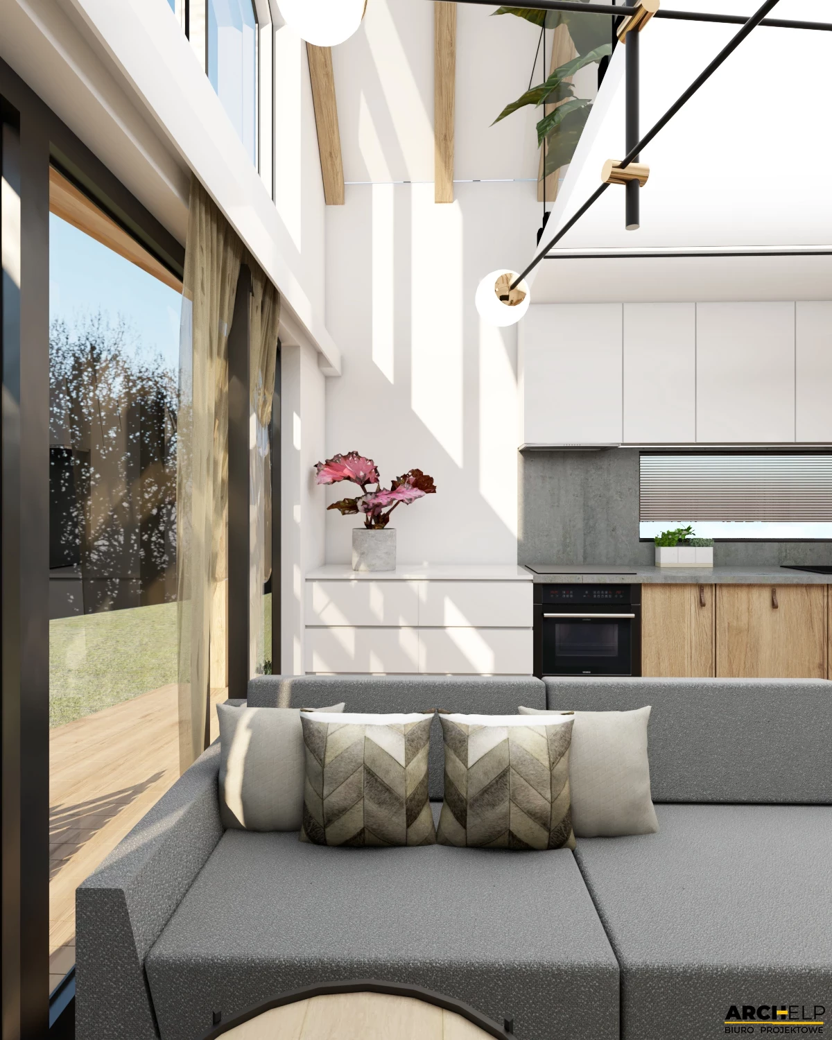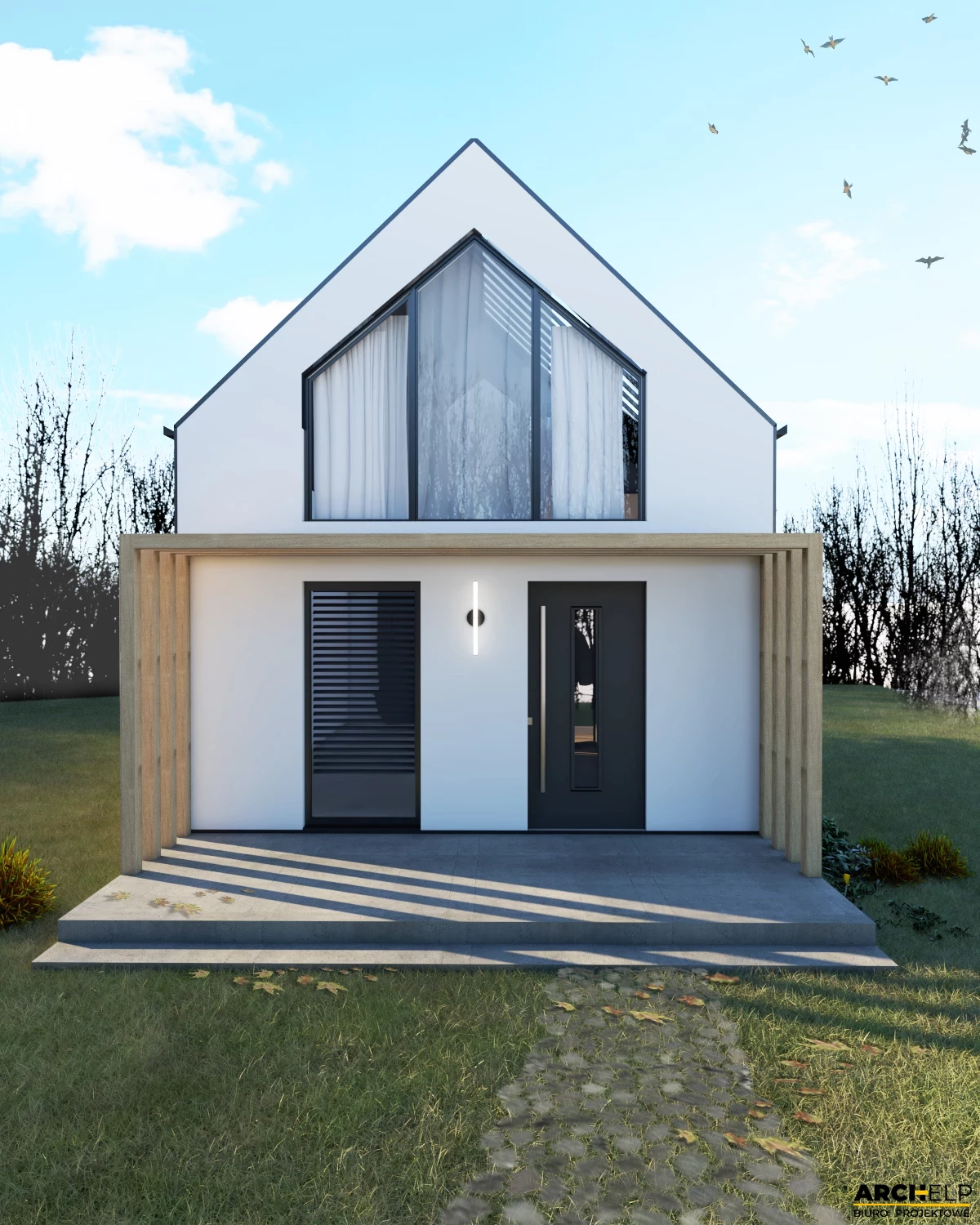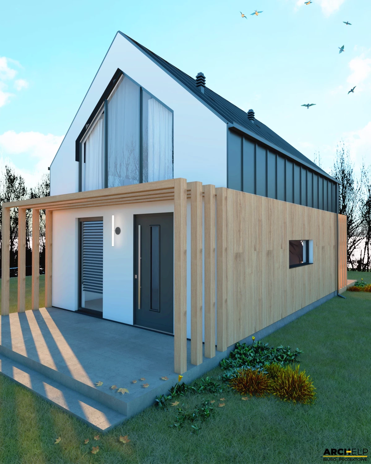 Projekt małego i nowoczesnego domku letniskowego, który NIE WYMAGA pozwolenia na budowę! Idealna propozycja dla osób ceniących sobie kontakt z naturą. Dzięki panoramicznym przeszklenią, które naturalnie doświetlają wnętrze możemy podziwiać otoczenie wokół budynku. Bryła budynku dzięki prostemu kształtowi i wykończeniu jest utrzymana w stylu nowoczesnej stodoły. Dach dwuspadowy pokryty blachą na rąbek, która częściowo jest również położona na ścianach. Tynk jasny który wspaniale współgra z drewnianą okładziną - to wszystko tworzy niezwykły efekt nowoczesnego budynku. Na parterze zaprojektowano mały wiatrołap, łazienkę z prysznicem oraz strefę dzienną gdzie znajdziemy salon z sofą przed TV, stół z krzesłami i aneks kuchenny. Przesuwne przeszklenie tarasowe łączy wnętrze z tarasem. Strefa nocna mieści się na antresoli gdzie można wstawić 3 łóżka: dwa 1-osobowe i jedno 2-osobowe. Dwa panoramiczne przeszklenie gwarantują piękny widok po przebudzeniu.